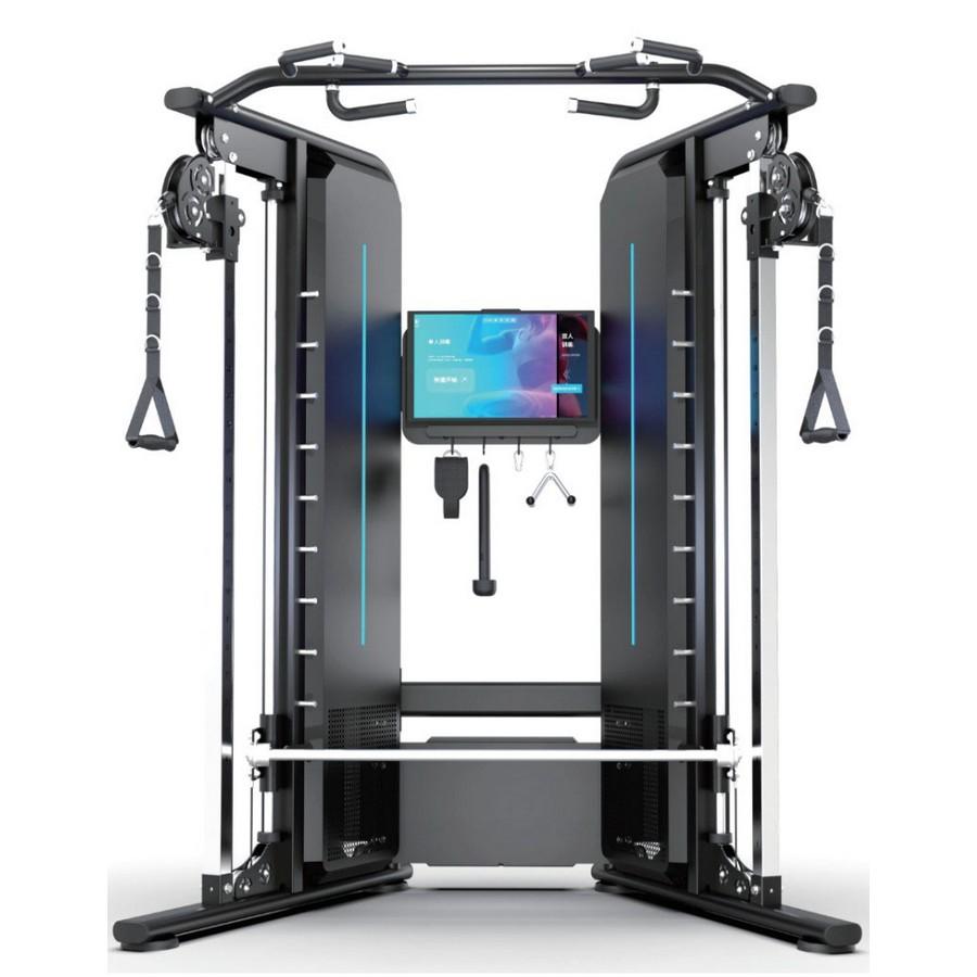 Машина Смита имеет электронагрузку без необходимости нагружения дисками, нагрузка изменяется на удобном мониторе тренажера. Машина Смита снабжена 10 парами держателей штанги на разных уровнях и резиновыми отбойниками в нижней части.