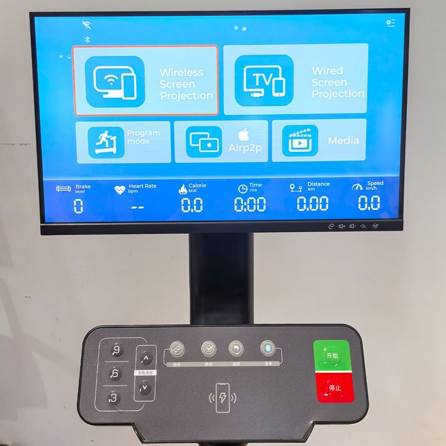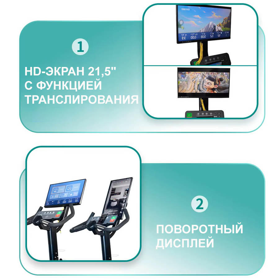 Оснащен большим IPS дисплеем (проекционный) с диагональю 21,5 дюйма на который можно транслировать изображение с любого устройства (телефон или планшет) по беспроводной технологии AirPlay (для Apple) или Wi-Fi (для Android). Также велотренажер имеет интерфейс для проводного подключения и просмотра контента с гаджетов. Экран снабжен поворотным механизмом, что позволяет смотреть видео как в горизонтальной, так и вертикальной ориентации (TikTok, Youtube Shorts и др.).