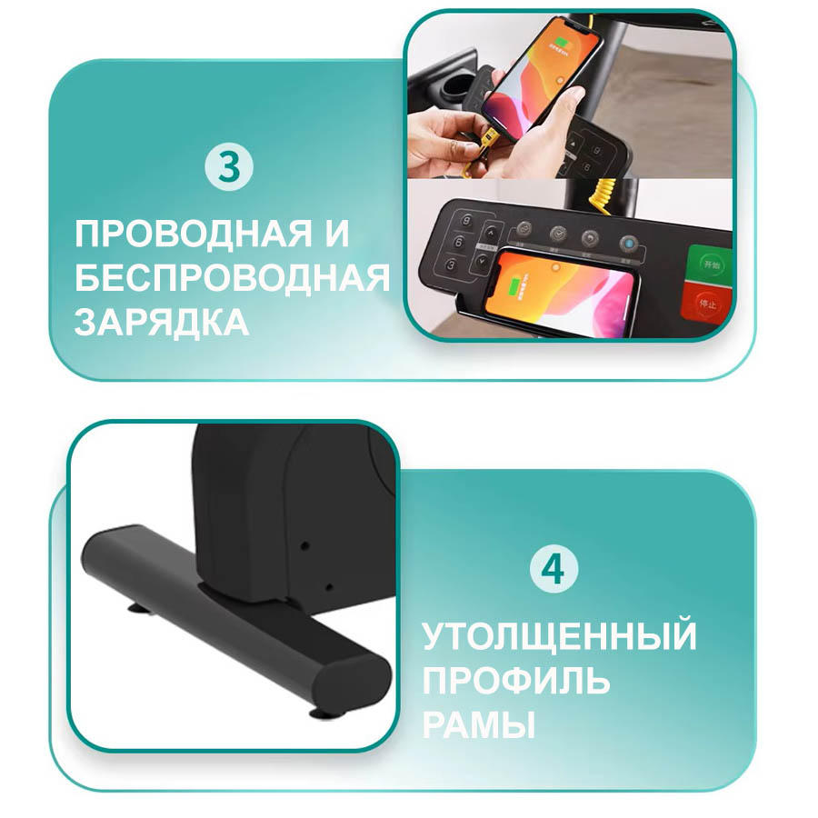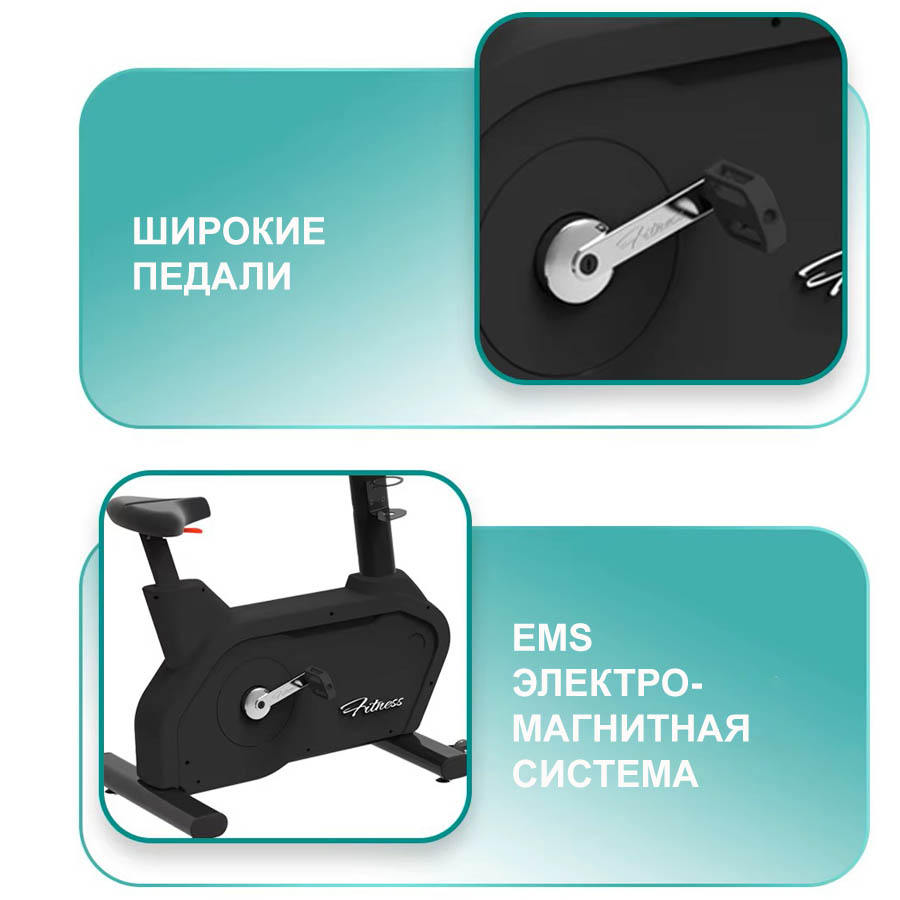 Переключение нагрузки происходит плавно и без рывков благодаря электромагнитной системе нагружения. Руль велотренажера покрыт нескользящим резиновым ТПР материалом. На центральных поручнях расположены кардиодатчики.